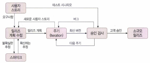 수시로 발생하는 고객의 요구사항에 유연하게 대응하기 위해 고객의 참여와 개발 과정의 반복을 극대화하여 개발 생산성을 향상시키는 방법.